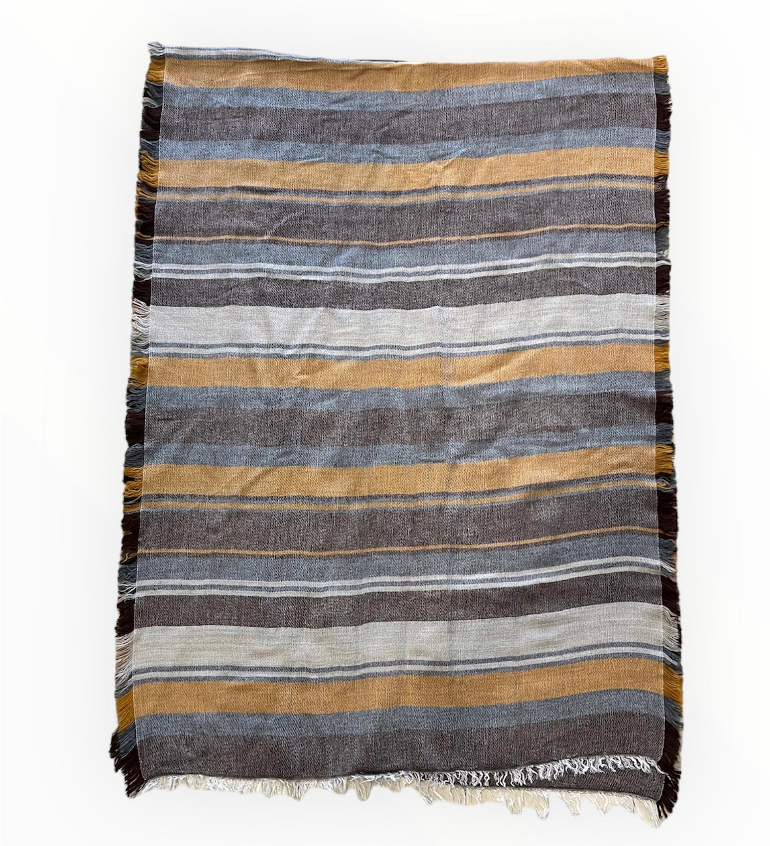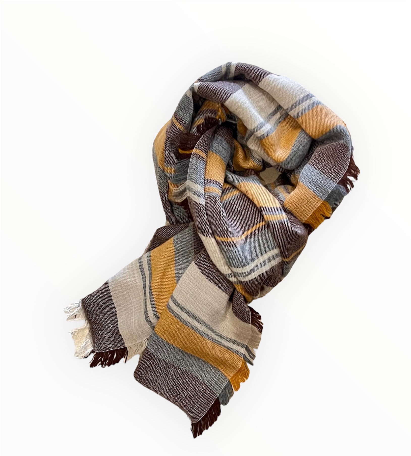 Une écharpe à rayures multicolores en bleu, orange, blanc et marron