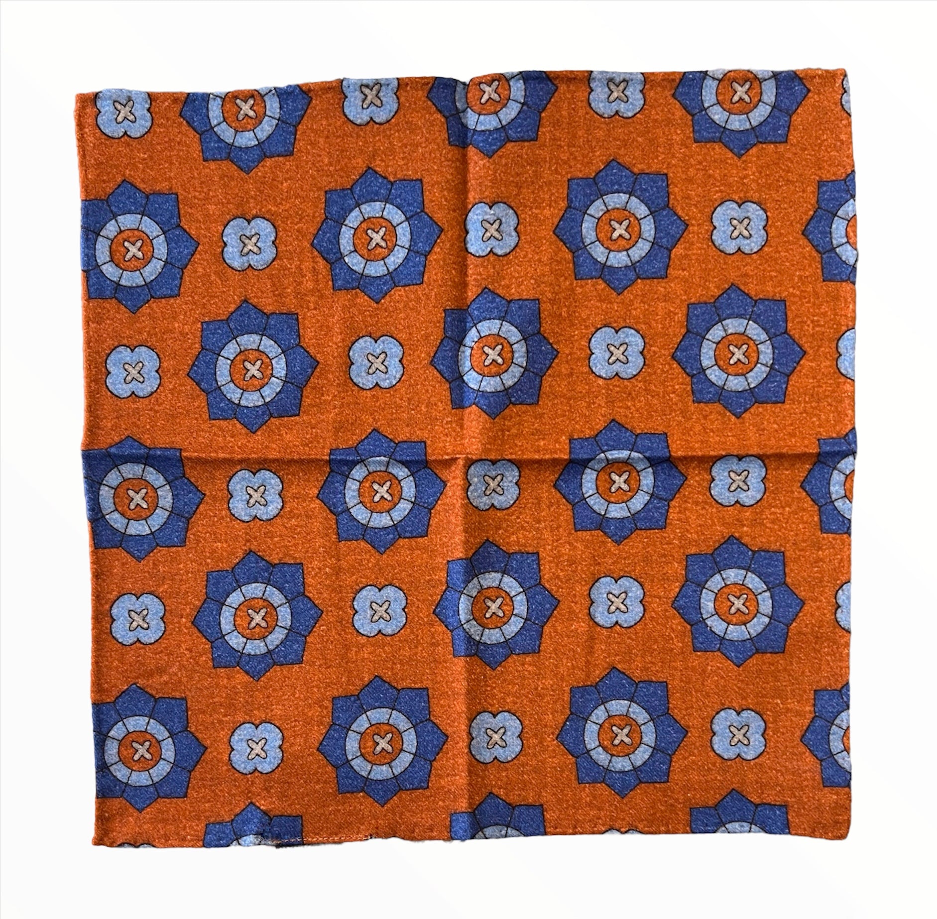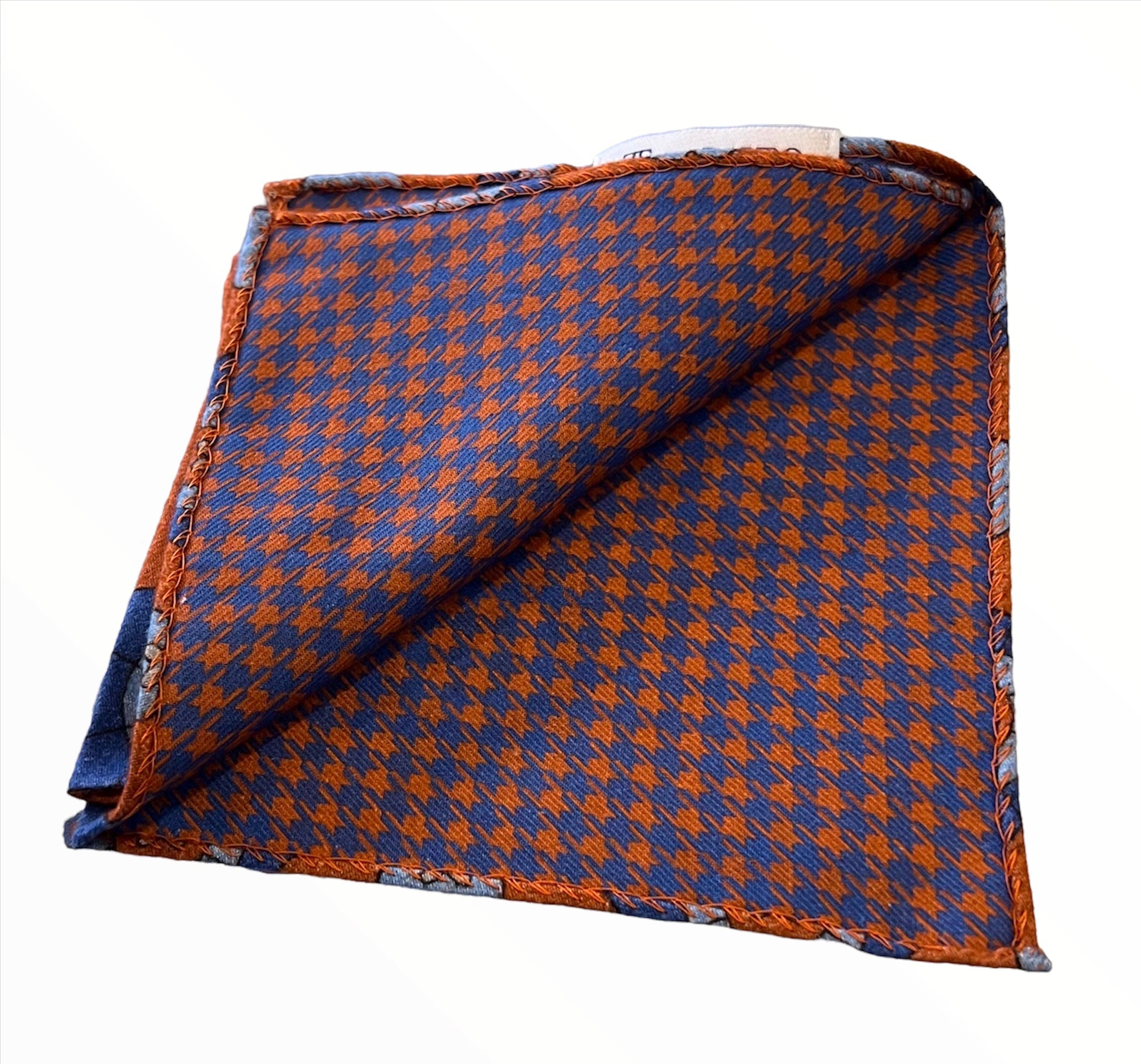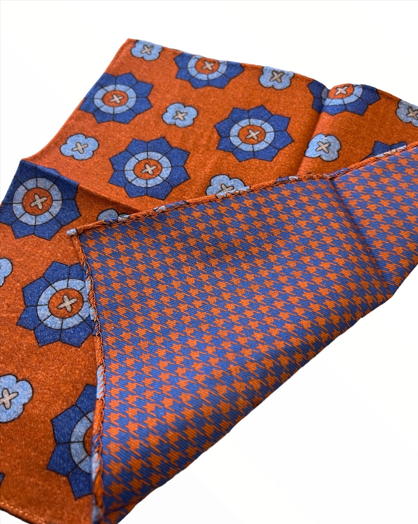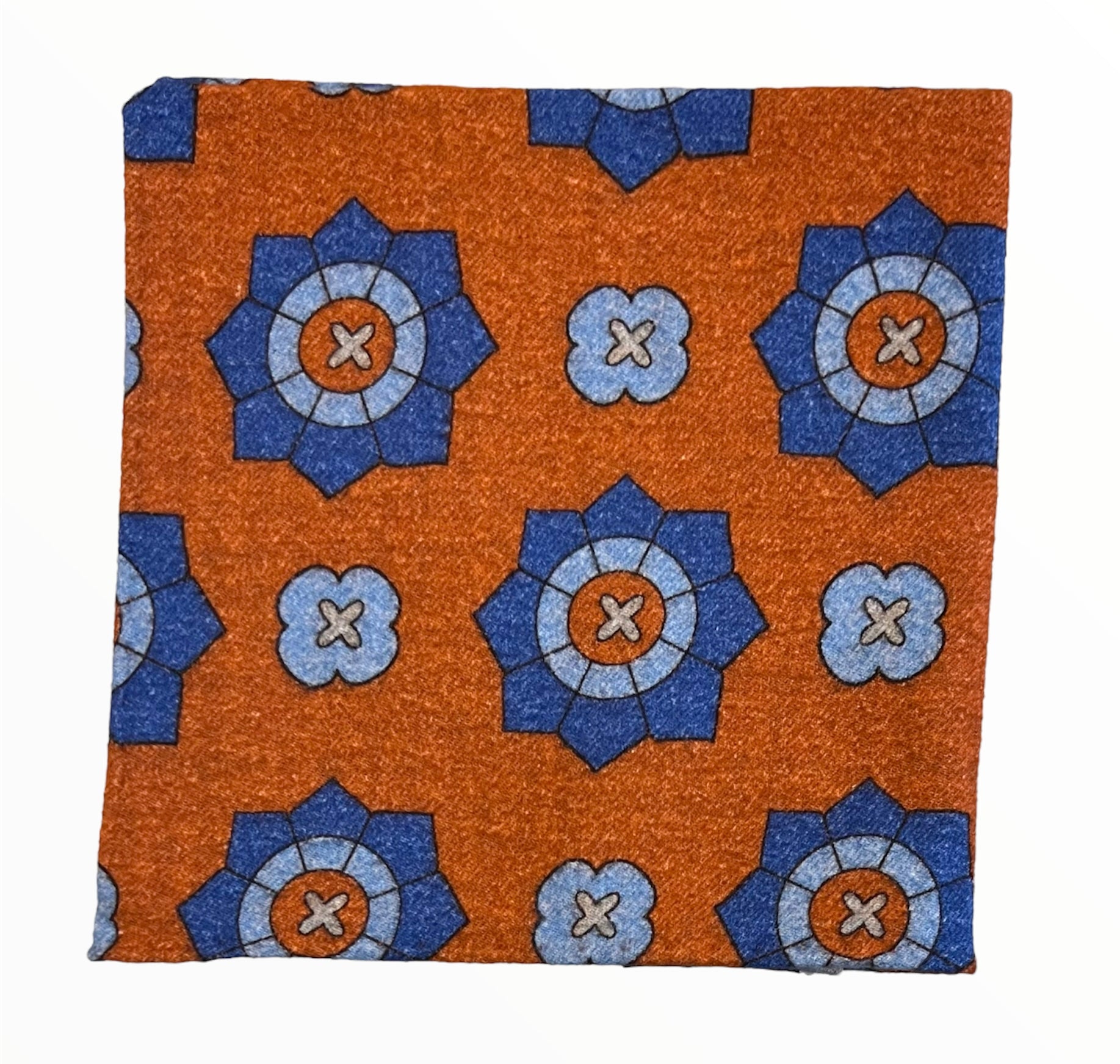 Une base orange avec des motifs bleu cobalt, bleu clair et blanc. Le côté opposé est dans un motif pied-de-poule orange et cobalt