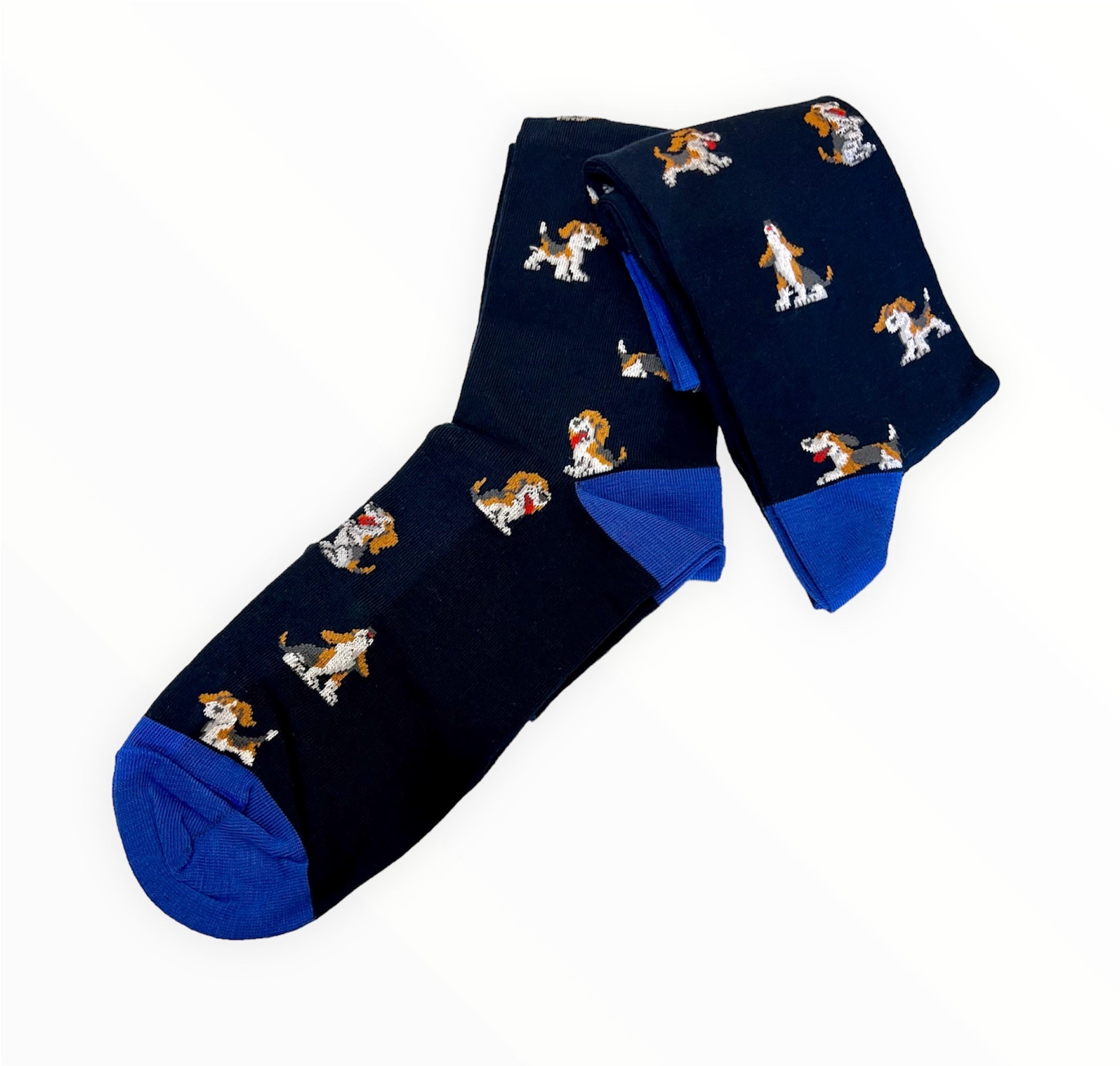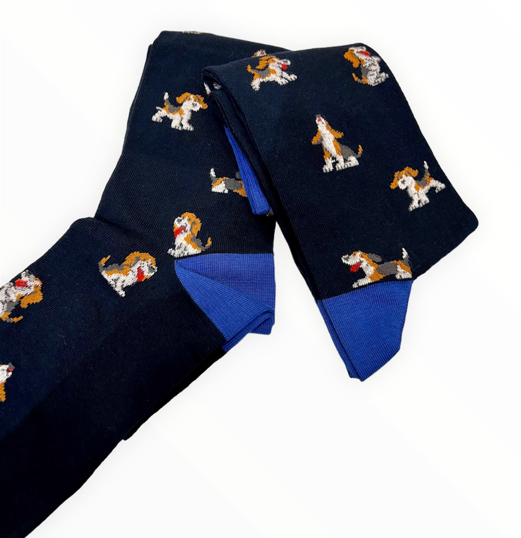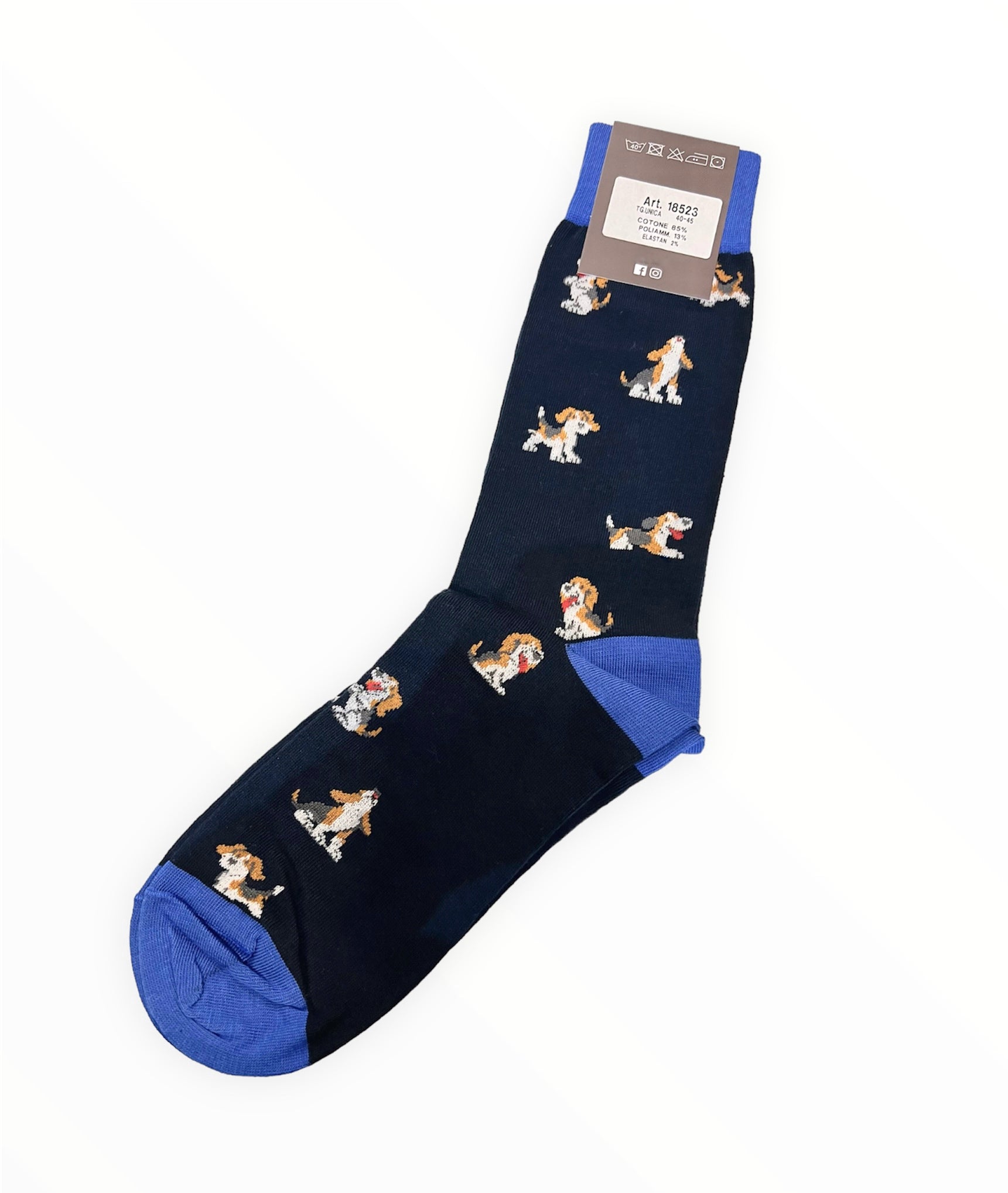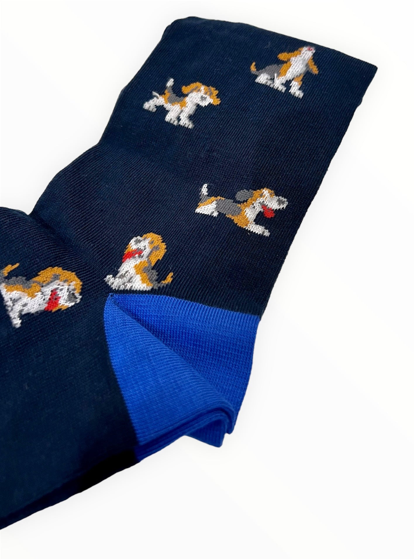 • A navy blue coloured base with dog motifs in white, brown, red and grey. Tops, heels and toes in a cobalt blue