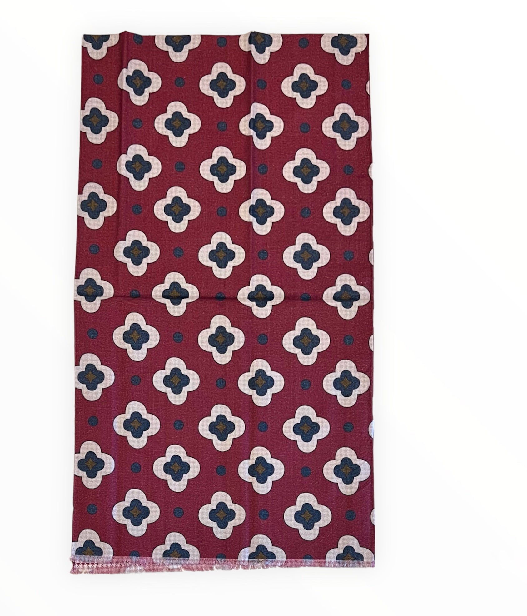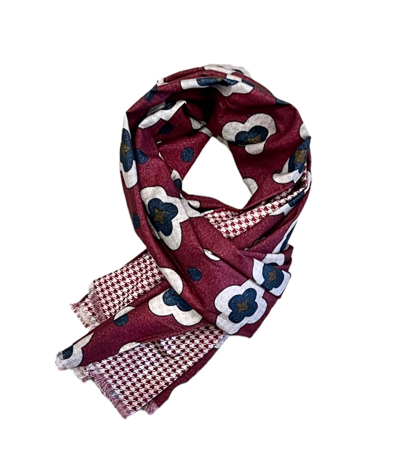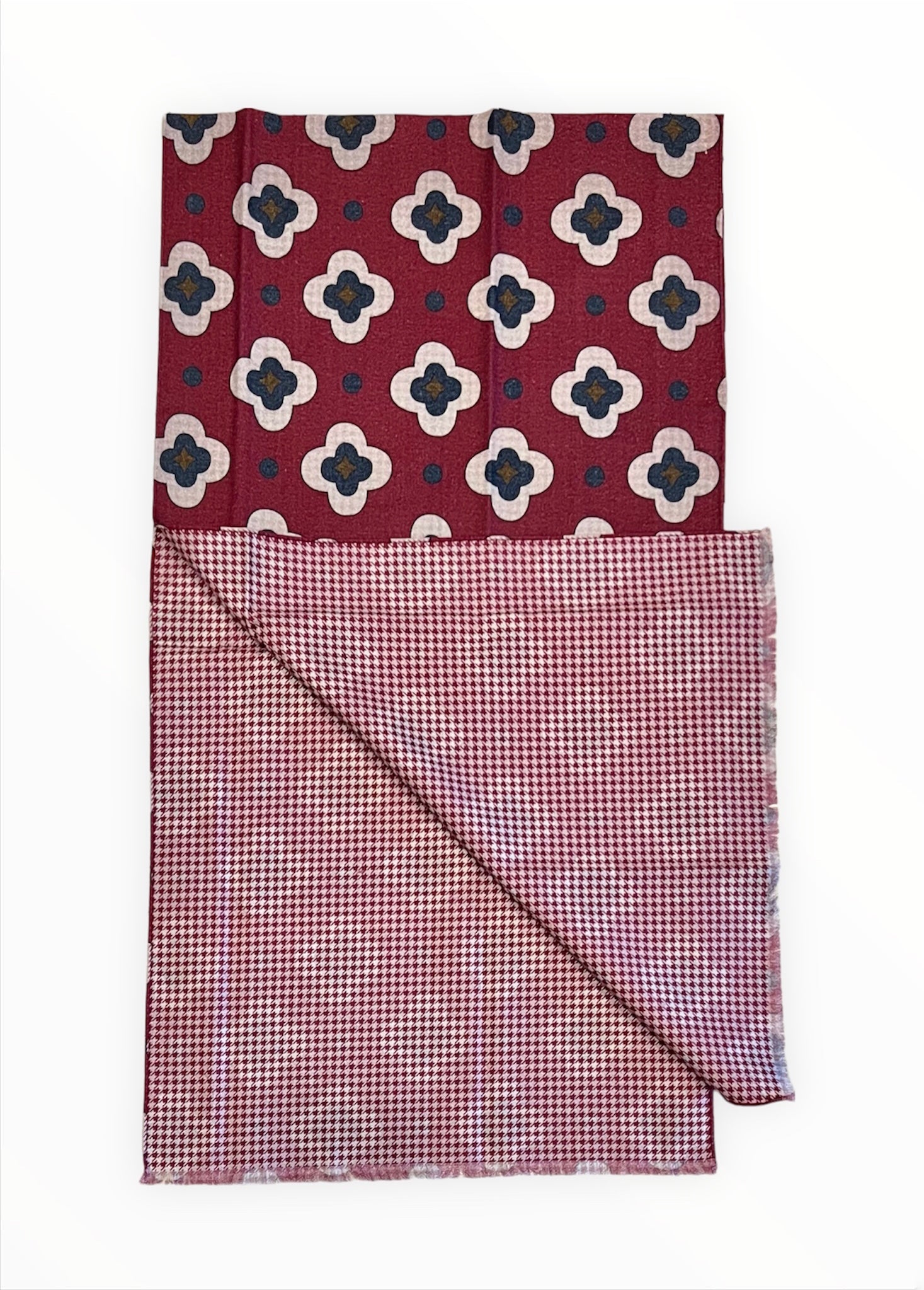 A deep red base with white, brown & navy patterns, the reverse side is a deep red and white houndstooth pattern